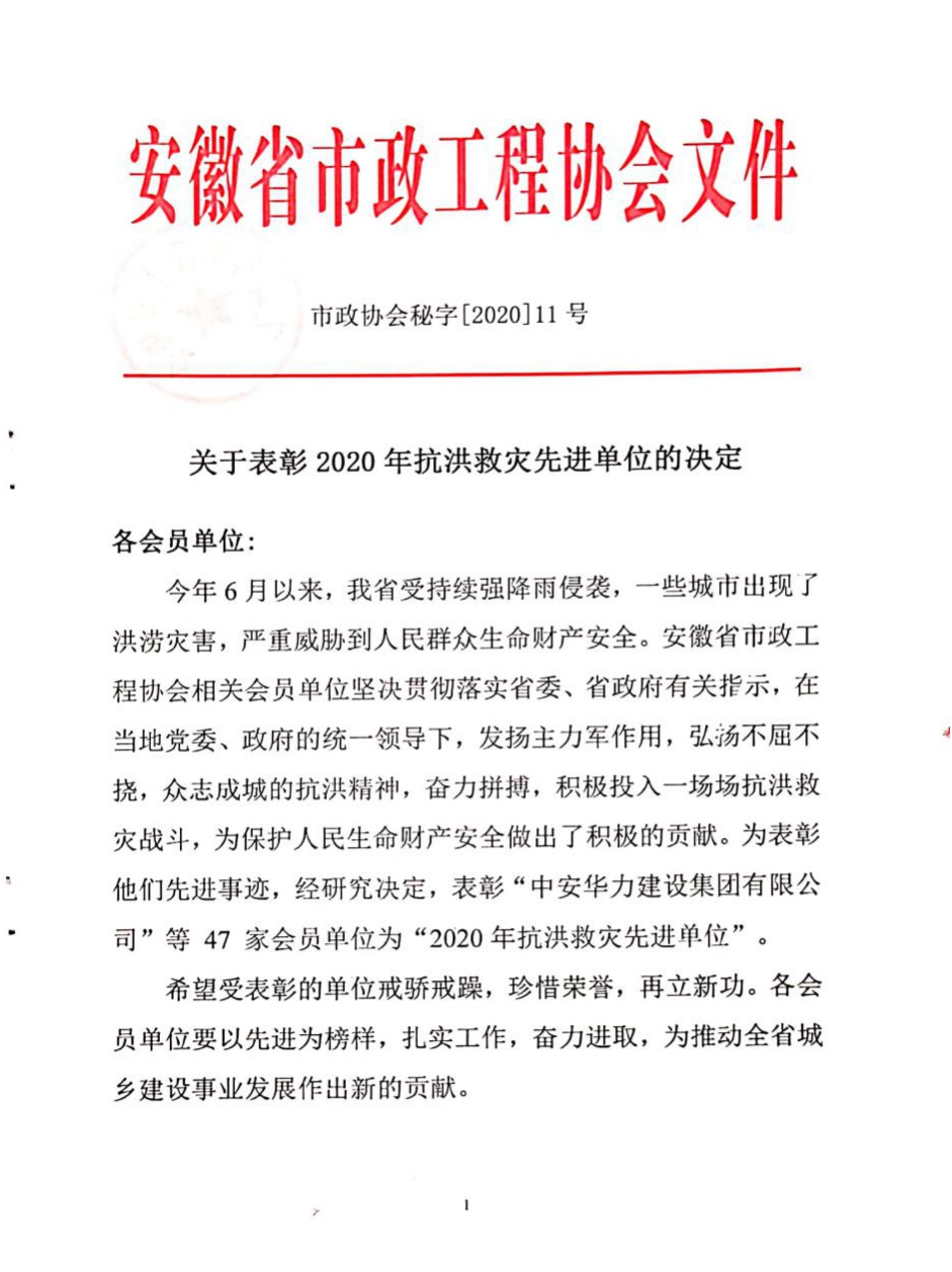 2020年8月17日,黃山新洲建設(shè)集團有限公司榮獲“2020年抗洪救災(zāi)先進單位”稱號。