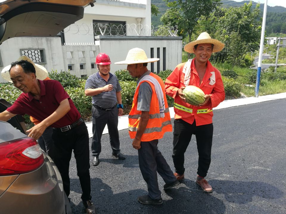 黨支部書記李惠明現(xiàn)場發(fā)放防暑降溫用品,表示慰問